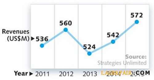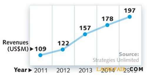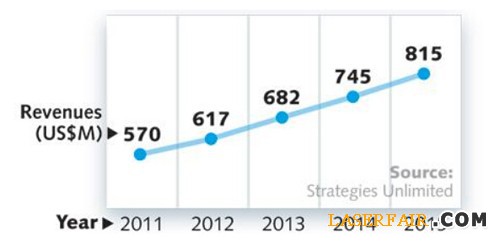 隨著激光影院市場的滲透和激光標識游戲的多樣化,激光照明顯示市場的營業(yè)收入持續(xù)固定增長。事實上,許多城市正在考慮“消滅”污染,即煙花匯演產生的固體垃圾也將有利于激光燈光秀的發(fā)展。隨著所有激光娛樂市場的發(fā)展,我們預測2015年娛樂和顯示應用的激光市場將增長近11%達到1.97億美元。