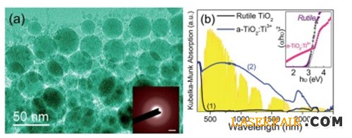 圖(a),非晶氧化鈦透射電鏡照片。插圖:電子衍射。圖(b),金紅石(曲線1)與中間帶氧化鈦(曲線2)光吸收圖譜,黃色背景為太陽光譜。插圖:Tauc光學帶隙。