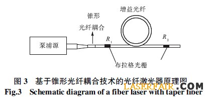 端面耦合技術(shù)將泵浦光聚焦到雙包層光纖內(nèi)包層端面處,直接耦合到雙包層光纖中,這種技術(shù)最大的特點(diǎn)在于結(jié)構(gòu)簡單,易于實(shí)現(xiàn),因此端泵浦技術(shù)在包層泵浦技術(shù)發(fā)展的初期被處于科技前沿的國內(nèi)外研究者廣泛采用。根據(jù)泵浦光和接受雙包層光纖兩者的數(shù)值孔徑和光斑大小,設(shè)計(jì)合適的透鏡組將泵浦光耦合進(jìn)雙包層光纖,在泵浦光功率較高時(shí),這種方法因受光面積所限,光纖端面處的光密度極高,故易造成光纖端面損傷;另一大缺陷在于,相對于耦合光斑來說,光纖端面接受面積太小,以至于稍微的位置偏移都會引起耦合效率的急遽下降。于是全光纖連接方案受到研究者的注意,錐形光纖耦合技術(shù)是最初考慮的途徑之一,如圖3 所示。