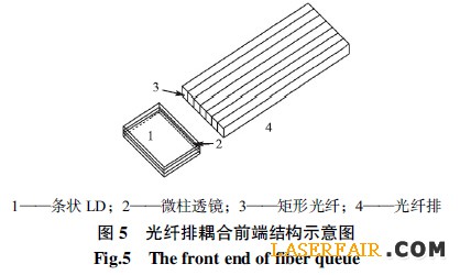 斜角光纖耦合技術(shù)和棱鏡耦合技術(shù)屬于同一種泵浦原理的耦合技術(shù),但就工藝難度相比而言,斜角光纖耦合技術(shù)最容易實(shí)現(xiàn)。根據(jù)有關(guān)理論分析,斜角光纖的耦合效率與端面斜角有關(guān),最大耦合效率時(shí)存在唯一一個(gè)最佳角度,該最大耦合效率值與光纖參數(shù)有關(guān)。另外,斜角光纖耦合技術(shù)對于非尾纖輸出的條狀半導(dǎo)體激光器泵浦光的耦合特別有效,將數(shù)根矩形光纖或玻璃絲排列成光纖排,前端面與條狀LD 輸出面通過微柱透鏡耦合(見圖5),后端的光纖或玻璃絲各自獨(dú)立,每根末端均磨成斜角,分別在雙包層光纖內(nèi)包層側(cè)面的不同位置耦合,適用于多點(diǎn)泵浦。