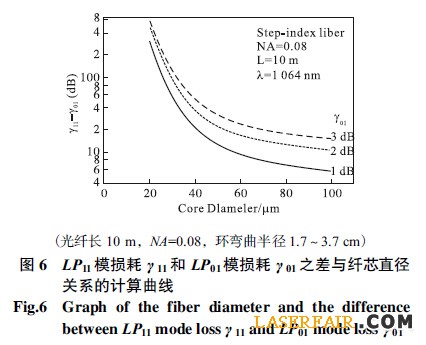 2000 年,Koplow 等人報(bào)道了一個(gè)多模雙包層光纖環(huán)獲得的單橫模激光輸出。他們采用的摻鐿雙包層光纖纖芯直徑為25μm,纖芯數(shù)值孔徑0.1,在波長1064nm 處的V 值為7.4。在光纖不繞環(huán)之前,激光器多模輸出;經(jīng)過光纖繞環(huán)后,除基模之外的其他模式損耗明顯增大,以LP11模為例,如圖6所示:纖芯直徑在50~100μm(V 值為12~24),光纖內(nèi)LP11模的彎曲損耗比基模LP01的彎曲損耗至少大幾個(gè)dB,特別是在基模LP01的彎曲損耗為3dB 時(shí),兩者之差達(dá)到10dB 以上。最后激光器光束輸出質(zhì)量因子M2 達(dá)到1.09,研究結(jié)果證明光纖環(huán)的模式選擇作用非常有效。