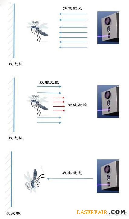機(jī)器工作的原理嘛,是先發(fā)出低能量無(wú)害的紅外探測(cè)激光,并由反光板反射回來(lái),組成一道探測(cè)用的“光墻”。當(dāng)蚊子觸碰到“光墻”時(shí),由激光器立刻再發(fā)出一道激光到蚊子身上,通過(guò)尺寸與翅膀振動(dòng)頻率確認(rèn)是蚊子,并且空間無(wú)障礙物。隨后,立刻發(fā)射高能的攻擊性激光,將蚊子擊落。