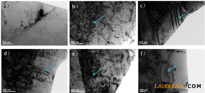 d)沖擊后位錯(cuò)割接;e)沖擊后位錯(cuò)墻;f)沖擊后亞晶界