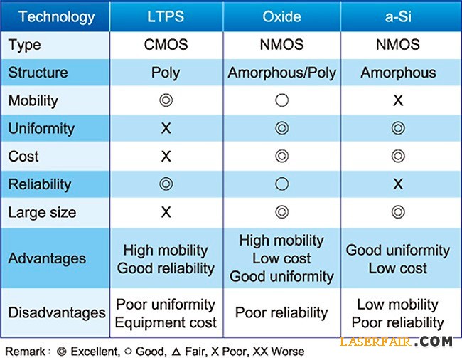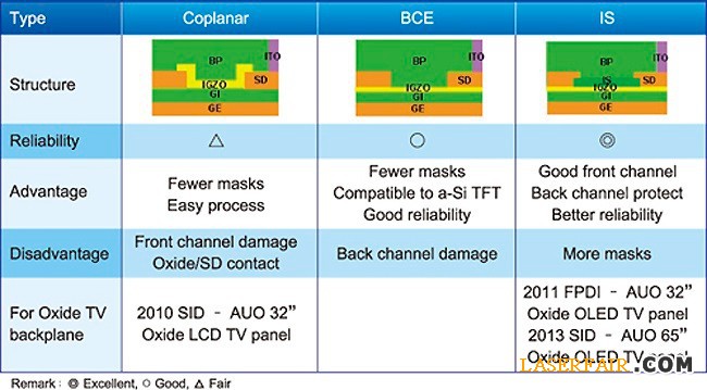 常見的氧化物半導(dǎo)體如氧化銦鎵鋅(InGaZnO),是一種電子移動率可達(dá)10平方厘米(cm2)/VS的新材料,為傳統(tǒng)非晶矽(<1cm2/VS)的數(shù)十倍以上。加上非晶(Amorphous)結(jié)構(gòu)可以在大尺寸獲得良好的均勻度,適合應(yīng)用在大尺寸面板,達(dá)到高清晰度、低能耗、低漏電的優(yōu)點,但其可靠度不??佳以及PMOS制造工藝?yán)щy一直是亟待改善的技術(shù),前者是量產(chǎn)商品化必須克服的重要關(guān)鍵,后者可用補償電路(Compensation Circuit)加以克服。