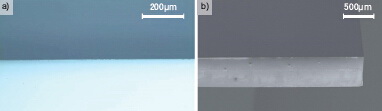 圖2:使用Spirit 1040-IMC激光器,運(yùn)用ClearShape工藝對(duì)康寧化學(xué)強(qiáng)化大猩猩玻璃(厚度為0.55mm、壓縮層深度為20μm)進(jìn)行直線切割后,未進(jìn)行任何后期處理結(jié)果示例。切割速度最高達(dá)4m/s。割邊俯視圖展示了極佳的切割質(zhì)量,在表面未形成任何豁口(圖a),而割邊側(cè)視圖展示了清晰光滑的表面,粗度小于0.1μm。