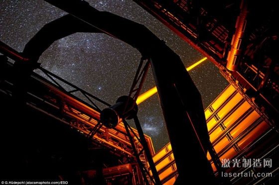 智利歐洲南方天文臺(tái)帕拉納爾天文臺(tái)操作的這個(gè)新PARLA激光器。從圖上可以看到,7瓦特激光器發(fā)出的橙黃色光束從甚大望遠(yuǎn)鏡的望遠(yuǎn)
