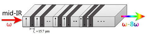 然而,要在單塊非線性晶體中實現更高次諧波的產生卻是一個難以攻克的關卡,這是由于在高次諧波實現的過程中涉及的非線性上轉換過程很多,而單塊晶體所能提供的倒格矢很難同時對這些過程中的相位失配進行補償。在世界范圍內,為了實現高轉換效率的高次諧波產生,只能利用多塊非線性晶體級聯(lián)使用,同時需要精細地控制每塊晶體的相位匹配條件,以獲得盡可能高的轉換效率。自非線性光學誕生50年以來,還沒有在單塊晶體中獲得高效的高次諧波產生。最近,該研究組利用原創(chuàng)性的科學思路和技術方案,在這一重要的科學難題上獲得了突破性的研究進展。該課題組利用啁啾結構非線性光子晶體具有寬帶倒格矢分布的特點,首次實現寬帶超連續(xù)高次諧波的產生,在單塊晶體中實現了二到八次諧波的同時產生。