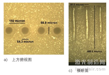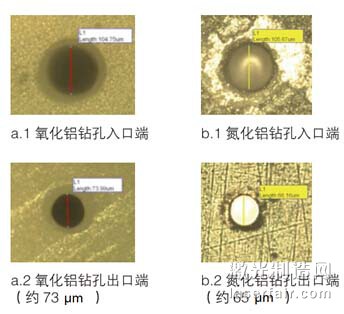 圖3 表示在厚度為381 μm的氮化鋁上,以300 孔/s的速度鉆孔。測(cè)量顯示入口端直徑約為42 μm,出口端約為31 μm。與相同厚度的氧化鋁相比,氮化鋁需要的峰值功率更高,脈沖周期更長(zhǎng)。