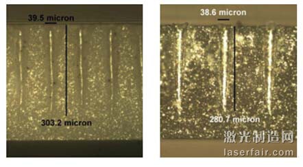 圖5a 表示用多模傳輸光纖在厚度為320μm的氧化鋁上進(jìn)行“大孔徑”鉆孔。鉆孔速度為100 孔/s,出口端直徑為320 μm。圖5b 表示在厚度為320 μm的氮化鋁上沿掃描方向鉆孔,孔間距325 μm,鉆孔速度同樣為100 孔/s。2000 余個(gè)鉆孔的測(cè)量結(jié)果顯示,入口端約105 μm,出口端約65±9 μm。