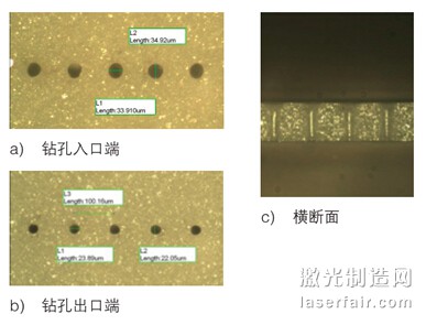 圖4 表示在厚度為100 μm的氧化鋁(99.6%)上,以3000 孔/s的速度操作后觀察孔的形態(tài)。測(cè)量結(jié)果顯示,鉆孔入口端直徑約為33 μm,出口端直徑約為22 μm。