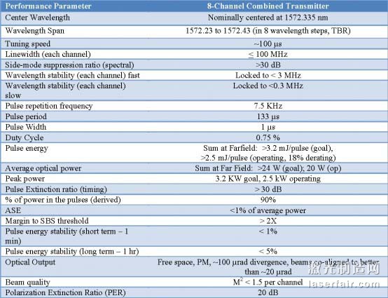 表中概述了激光發(fā)射器的光學性能要求,這些要求來源于二氧化碳測量和儀器結(jié)構(gòu)的科學目標,決定采用主振蕩器功率放大器(MOPA)激光構(gòu)架是因為復雜的頻譜要求,決定采用摻鉺光纖放大器(EDFA)實現(xiàn)功率放大是因為技術(shù)成熟度和之前的性能驗證。