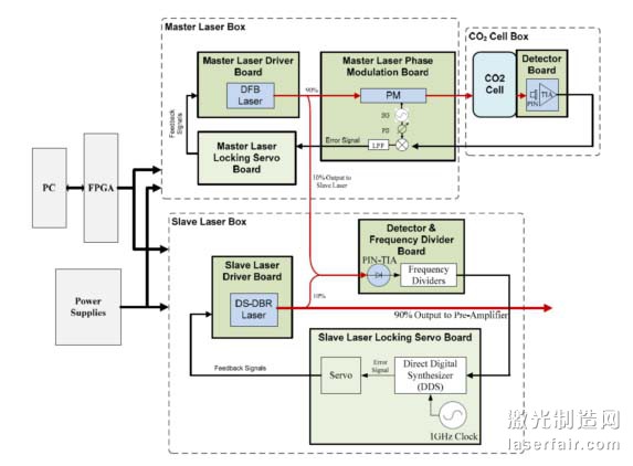 總體構(gòu)架由三個模塊組成:一個種子激光器模塊、一個前置放大器模塊、八個平行功率放大器模塊。種子模塊是能夠?qū)崿F(xiàn)多階波長、連續(xù)波輸出的二極管源。前置放大器模塊包括多個摻鉺光纖放大器(EDFA)級、調(diào)幅和將信號分成8個不同輸出光纖的信號分頻器。每個前置放大器輸出光纖饋送一個功率放大器模塊。