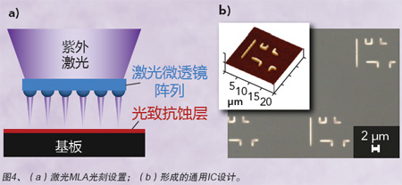 由于受到樣品表面形成的微球體陣列尺寸的限制,微球體陣列技術(shù)輔助激光納米加工形成的納米結(jié)構(gòu)一般極小, 面積低于1 平方厘米。同時(shí),在自排列或旋轉(zhuǎn)涂布形成微球體陣列期間產(chǎn)生缺陷。激光微透鏡陣列(MLA) 光刻處理更容易, 更適用于大規(guī)模生產(chǎn)工業(yè)應(yīng)用的納米結(jié)構(gòu)。MLA將入射激光光束分離為圖4(a)所示的成千上百萬微小激光光束,功能與分離和聚焦激光光束的微球體陣列相似。光致抗蝕刻涂抹的樣品安裝在一根7軸的納米臺(tái)上,并定位到MLA的聚焦平面。通過控制級(jí)的移動(dòng)和打開/ 關(guān)閉激光脈沖, 能夠通過激光輻照在光致抗蝕刻層上形成任意圖案。圖4(b)顯示在石英基板上形成的通用IC設(shè)計(jì)陣列。激光MLA光刻具有以平行模式高速形成大面積任意納米結(jié)構(gòu)的獨(dú)特優(yōu)點(diǎn)。該方法也可以用于在各種基板表面形成功能性納米結(jié)構(gòu),例如撓性聚合物薄膜上的裂環(huán)諧振器(SRR)陣列,它能被卷起,作為3D超材料管道應(yīng)用于超敏感應(yīng)。