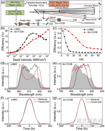 圖2. 激光實(shí)驗(yàn)裝置原理圖及采用Sm:YCOB與BBO晶體分別實(shí)現(xiàn)QPA和OPA在轉(zhuǎn)換效率、相位失配容許、輸出光波形、壓縮脈寬等方面的對(duì)比