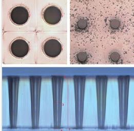 圖1:準(zhǔn)分子激光器(193nm)在玻璃上鉆通孔:25μm直徑的孔入口(a)、孔出口(b)和剖面圖(c)。