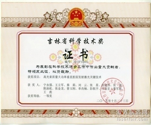 發(fā)光學(xué)及應(yīng)用國家重點(diǎn)實(shí)驗(yàn)室(發(fā)光室)大功率半導(dǎo)體激光器及應(yīng)用團(tuán)隊(duì)在高光束質(zhì)量大功率垂直腔面發(fā)射激光關(guān)鍵技術(shù)研究上取得重大突破,研究成果獲2015年度吉林省技...