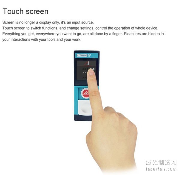 dTape 5T不只是一款普通的數(shù)碼尺,它配備有觸摸屏,通過藍(lán)牙與手機(jī)APP相連接。屏幕不再只有顯示的功能,還能輸入數(shù)據(jù)。輕觸屏幕就能進(jìn)行切換功能和調(diào)整設(shè)置等操作,用手指就能輕松完成一切。