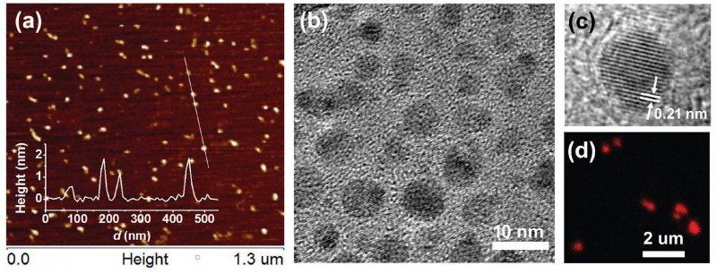 圖1.橙紅光碳納米點的原子力圖(a),透射電鏡圖(b),高分辨透射電鏡圖(c)和共聚焦圖(d)。