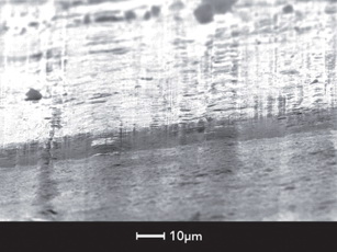 圖3:在激光織構(gòu)中波紋度的細(xì)微變化,較低的部分是通過(guò)激光織構(gòu)實(shí)現(xiàn)的(見圖10:在高倍放大鏡下觀察到的織構(gòu)區(qū)域)