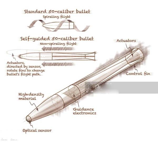 狙擊手在使用制導(dǎo)子彈時(shí),只要鎖定目標(biāo),不論朝哪個(gè)方向射擊,子彈最后都能通過(guò)自主修正彈道命中目標(biāo)。這張手繪圖展示了制導(dǎo)子彈和傳統(tǒng)子彈之間的顯著區(qū)別,傳統(tǒng)子彈需要靠自旋穩(wěn)定彈道(上),制導(dǎo)子彈(下)無(wú)需自旋,直接靠尾部的彈翼就可改變飛行彈道。有人吐槽稱,配備這種子彈后,人人都能成為神槍手,或許狙擊手的時(shí)代就此結(jié)束了。吐槽歸吐槽,制導(dǎo)子彈的實(shí)戰(zhàn)效果仍需拭目以待。