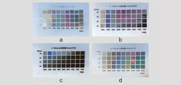 圖3中,離焦量分別取+4mm、+3mm、+2mm、+5mm。打標(biāo)色盤中,橫坐標(biāo)為激光功率,由35%至75%等間隔遞增,縱坐標(biāo)為激光頻率,由20kHz至35kHz等間隔遞增。觀察角度為60°(與工件表面呈60°觀察)。圖3(c)中,離焦量為+2mm時(shí),可見大部分的打標(biāo)方塊內(nèi)的不銹鋼表面被灼燒至焦黃偏黑,此時(shí)材質(zhì)表面離焦點(diǎn)較近,激光能量密度偏大,打標(biāo)色盤中的顏色不夠豐富。由(a)、(b)、(d)可以看出,在20~35kHz的頻率范圍內(nèi),當(dāng)激光功率不變時(shí),隨激光頻率變化,打標(biāo)顏色幾乎不變。打標(biāo)顏色主要隨激光功率的變化而改變。當(dāng)離焦量為+3mm時(shí),在某一頻率下,隨激光功率增大,打標(biāo)顏色變化規(guī)律為:淡黃→藍(lán)色→淡綠→粉紅→紫紅→深紫→黃黑;當(dāng)離焦量為+4mm時(shí),隨激光功率增大,打標(biāo)顏色變化規(guī)律為:淡黃→金黃→深藍(lán)→黃綠→紫紅→墨綠;當(dāng)離焦量為+5mm時(shí),隨激光功率增大,打標(biāo)顏色變化規(guī)律為:淡黃→金黃→淡藍(lán)→黃綠→紫紅→墨綠。這些規(guī)律與前述理論推導(dǎo)的規(guī)律大體相符。