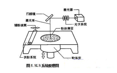 選擇性激光燒結(jié)技術(shù)(Selective Laser Sintering,SLS)又稱為選區(qū)激光燒結(jié)技術(shù),其使用激光束熔化或燒結(jié)粉末材料,利用分層思想,把計(jì)算機(jī)中的CAD模型直接成形為三維實(shí)體零件。它的創(chuàng)新之處在于將激光、光學(xué)、溫度控制和材料相聯(lián)系,并借助精確引導(dǎo)的激光束使材料粉末燒結(jié)或熔融后凝固形成三維原型或制件。 選擇性激光燒結(jié)技術(shù)工藝原理如圖5所示。其工藝過(guò)程是,用紅外線板將粉末材料加熱至恰好低于燒結(jié)點(diǎn)的某一溫度,然后用計(jì)算機(jī)控制激光束,按原型或零件的截面 形狀掃描平臺(tái)上的粉末材料,使其受熱熔化 或燒結(jié)。繼而平臺(tái)下降一個(gè)層厚,用熱輥將 粉末材料均勻地分布在前一個(gè)燒結(jié)層上,再 用激光燒結(jié)。如此反復(fù),逐層燒結(jié)成形。全部燒結(jié)后去掉多余的粉末,再進(jìn)行打磨、烘 干等處理便獲得原型或零件。這種工藝與立 體印刷成形(SLA)基本相同,只是將SLA 中的液態(tài)樹(shù)脂換成在激光照射下可以燒結(jié)的粉末材料,并由一個(gè)溫度控制單元優(yōu)化的輥?zhàn)愉伷讲牧弦员WC粉末的流動(dòng)性,同時(shí)控制工作腔熱量使粉末牢固黏結(jié)。SLS技術(shù)不受零件幾何形狀的限制,不需要任何的工裝模具,可以縮短產(chǎn)品的研發(fā)周期,降低生產(chǎn)成本,提高產(chǎn)品的市場(chǎng)競(jìng)爭(zhēng)力。其造型速度快,一般制品僅需1~2天即可完成。