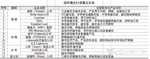 以德國、美國、日本、俄羅斯為代表的少數(shù)發(fā)達國家,目前主導(dǎo)和控制著全球激光技術(shù)和產(chǎn)業(yè)的發(fā)展方向(見附表)。其中,德國Trumpf、Rofin-Sinar公司在高功率工業(yè)激光器上稱雄天下;美國IPG公司的光纖激光器引領(lǐng)世界激光產(chǎn)業(yè)發(fā)展方向。歐美主要國家在大型制造產(chǎn)業(yè),如機械、汽車、航空、造船、電子等行業(yè)中,基本完成了用激光加工工藝對傳統(tǒng)工藝的更新?lián)Q代,進入“光加工”時代。