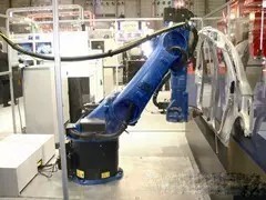 (3)激光焊接機器人基于機器人激光加工系統(tǒng)應(yīng)用于汽車制造業(yè)。汽車車門、底板激光遠程掃描焊接成套設(shè)備。采用高功率光纖激光器或者碟片激光器, 研究機器人6軸與振鏡3軸的聯(lián)動控制系統(tǒng),汽車底板激光遠程掃描焊接生產(chǎn)線與汽車車門激光遠程掃描生產(chǎn)線工藝規(guī)劃,激光遠程掃描焊接工藝與質(zhì)量檢測技術(shù) 等,滿足三維車身焊點的高效定位,車門激光焊接長度≥4000mm,底板激光焊接長度≥4000mm,激光焊接速度≥30m/min,用于汽車工業(yè)具體操 作如圖5所示。