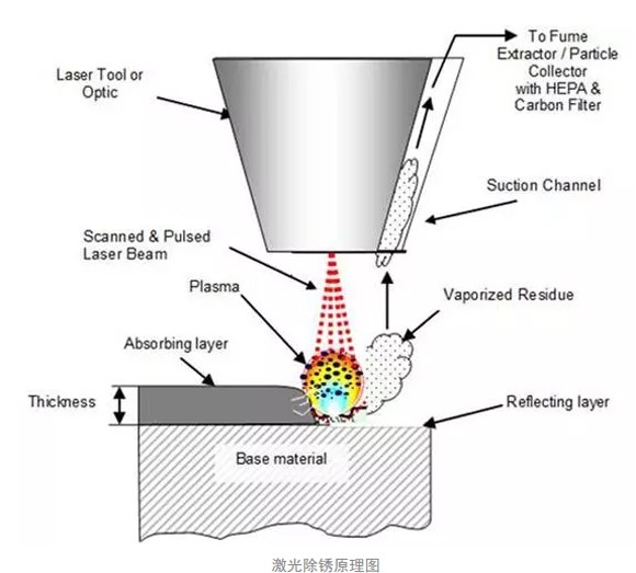 利用激光高能、高頻率、高功率的特性,把高能量瞬間沉積在很小的一片區(qū)域內(nèi),利用高溫灼化氧化層,又稱為激光清洗。