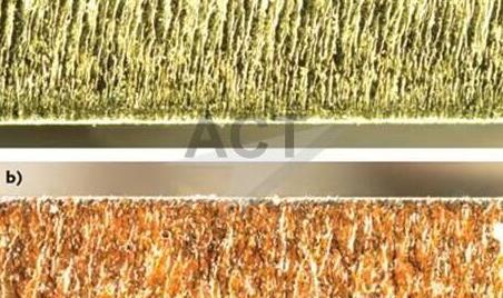 圖6:不受背向反射的影響,使得某些高反射金屬材料的切割成為可能。橫截面視圖顯示了用相干的Highlight FL激光器切割1.25mm厚的黃銅(a)和1.2mm的銅(b)。