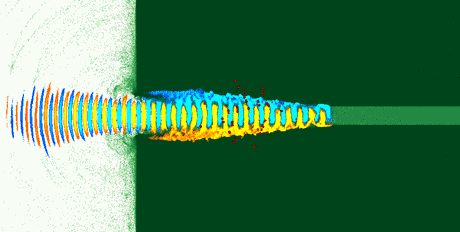 瑞菲夫和其研究同時(shí)開(kāi)啟德克薩斯拍瓦激光器,這是一個(gè)在這個(gè)世界上最強(qiáng)大的激光器。他們將目標(biāo)鎖定在一塊堅(jiān)實(shí)的塑料體上,這個(gè)塑料體與一個(gè)小房間鉆通,后者充滿(mǎn)了塑料泡沫。模擬是在一個(gè)超級(jí)計(jì)算機(jī)上進(jìn)行,即德克薩斯高級(jí)計(jì)算中心(TACC),模擬結(jié)果表明,激光穿過(guò)靶室而沒(méi)有產(chǎn)生一個(gè)洞,就像陽(yáng)光透過(guò)玻璃。一路上它激發(fā)了泡沫中的電子。這種高能電子粒子的等離子體,然后釋放一個(gè)受控制的超高能光子束,即γ射線(xiàn)