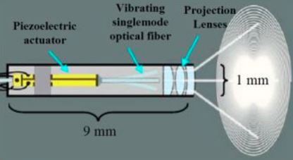 光纖頭掃出的圖像雖然很小,但是通過(guò)掃描光纖前部的放大鏡片組,就能產(chǎn)生比光纖孔徑大得多的圖像。如下圖所示。