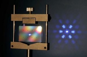 掃描光纖產(chǎn)生的圖像下一步將送到“光子光場(chǎng)芯片”。它是整個(gè)Magic Leap的技術(shù)核心,也難怪公司創(chuàng)始人在接受《連線》采訪時(shí)也驕傲地展示了這個(gè)類(lèi)似玻璃眼鏡片的東西。對(duì)物理知識(shí)略有了解的人都能猜出這塊“鏡片”可能是一種極為特殊的衍射光柵。