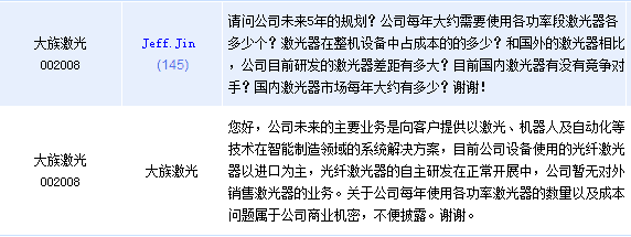 大族激光(002008)周二在全景網(wǎng)互動(dòng)平臺(tái)上表示,公司未來(lái)的主要業(yè)務(wù)是向客戶提供以激光、機(jī)器人及自動(dòng)化等技術(shù)在智能制造領(lǐng)域的系統(tǒng)解決方案,目前公司設(shè)備使用的光纖...