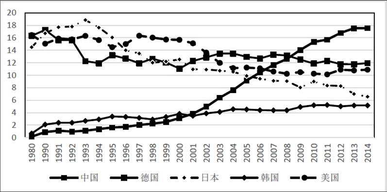 1980-2014年主要國家裝備制造業(yè)出口規(guī)模。資料來源:機械工業(yè)信息研究院