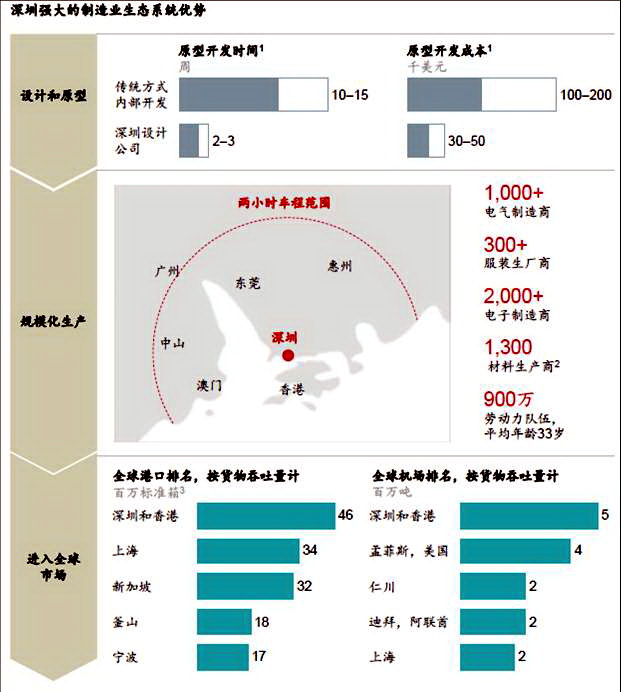 生態(tài)系統(tǒng)較為完善,具有成本、市場響應速度、服務等比較優(yōu)勢。如在深圳的兩個小時車程范圍內,擁有1000多家電氣制造商、300多家服裝制造商、2000多家電子制造商、1300多家材料制造商,近1000萬名勞動力,數(shù)量級的優(yōu)勢和完善的生態(tài)系統(tǒng),使得深圳的手機制造商在制造普通的功能手機的原型開發(fā)成本降低1/6-1/4,原型開發(fā)時間降低1/7-1/5。