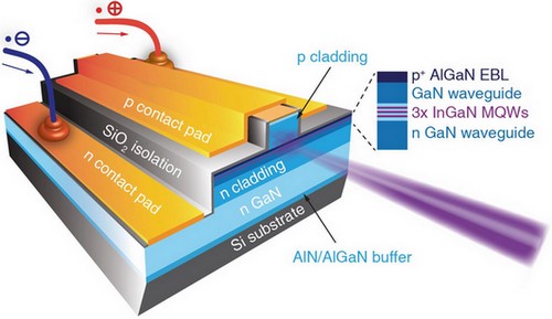 硅是半導(dǎo)體行業(yè)最常見的材料,基于硅材料的電子芯片被廣泛應(yīng)用于日常生活的各種設(shè)備中,從智能手機(jī)、電腦到汽車、飛機(jī)、衛(wèi)星等。隨著技術(shù)的發(fā)展,研究者發(fā)現(xiàn)通過傳統(tǒng)的電氣互聯(lián)來進(jìn)行芯片與系統(tǒng)之間的通信已經(jīng)難以滿足電子器件之間更快的通信速度以及更復(fù)雜系統(tǒng)的要求。為解決這一問題,“光”被認(rèn)為是一種非常有潛力的超高速傳輸媒介,可用于硅基芯片以及系統(tǒng)間的數(shù)據(jù)通信。但是,硅作為間接帶隙材料,發(fā)光效率極低,難以直接作為發(fā)光材料。研究人員提出利用具有高發(fā)光效率的III-V族材料作為發(fā)光材料,生長或者鍵合在硅襯底上,從而實(shí)現(xiàn)硅基光電集成。III族氮化物材料是一種直接帶隙材料,具有禁帶寬度寬、化學(xué)穩(wěn)定性強(qiáng)、擊穿電場高以及熱導(dǎo)率高等優(yōu)點(diǎn),在高效發(fā)光器件以及功率電子器件等領(lǐng)域有著廣泛的應(yīng)用前景,近年來已成為一大研究熱點(diǎn)。將InGaN基激光器直接生長在硅襯底材料上,為GaN基光電子器件與硅基光電子器件的有機(jī)集成提供了可能。另一方面,自1996年問世以來,InGaN基激光器在二十多年里得到了快速的發(fā)展,其應(yīng)用范圍遍及信息存儲、照明、激光顯示、可見光通信、海底通信以及生物醫(yī)療等領(lǐng)域。目前幾乎所有的InGaN基激光器均是利用昂貴的自支撐GaN襯底進(jìn)行制備,限制了其應(yīng)用范圍。硅襯底具有成本低、熱導(dǎo)率高以及晶圓尺寸大等優(yōu)點(diǎn),如果能夠在硅襯底上制備InGaN基激光器,將有效降低其生產(chǎn)成本,從而進(jìn)一步推廣其應(yīng)用。