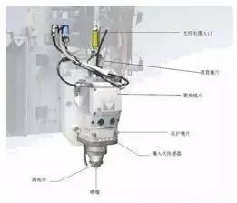 切割頭底部為噴嘴,在切割過程中,噴嘴與工件之間的距離(噴嘴高度)約0.5~1.5mm,不妨看作是一個固定值,即噴嘴高度不變,所以不能通過升降切割頭來調(diào)焦(否則無法完成切割加工)。