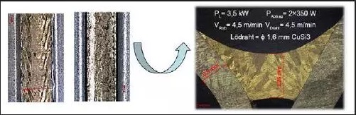 圖2 三纖芯三光點(diǎn)釬焊光路。特別設(shè)計的光路使具有不同芯徑的光纖通過一根操作光纖進(jìn)行傳輸,在釬焊區(qū)域內(nèi)產(chǎn)生不同尺寸的光斑。為了更直觀地評估三光點(diǎn)釬焊的優(yōu)勢,我們用1.6 mm的CuSi3合金焊絲、3.5 kW的光纖激光釬焊主光束,以4.5 m/min的速度對厚度為0.8 mm的熱浸鋼板樣件進(jìn)行釬焊。在采用350 W引導(dǎo)光束在釬焊前對材料進(jìn)行預(yù)清理以后,更好的邊緣一致性和表面光潔度明顯可見(如圖3)。