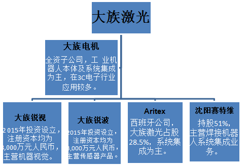 除了大族電機(jī),大族激光還在2015年投資設(shè)立了深圳市大族銳視科技有限公司和深圳市大族銳波傳感科技有限公司。大族銳視、大族銳波注冊(cè)資本均為3,000萬元人民幣。兩家公司的主營(yíng)業(yè)務(wù)在于機(jī)器視覺和傳感器等部件,進(jìn)一步提升公司在機(jī)器人產(chǎn)業(yè)的核心競(jìng)爭(zhēng)力。