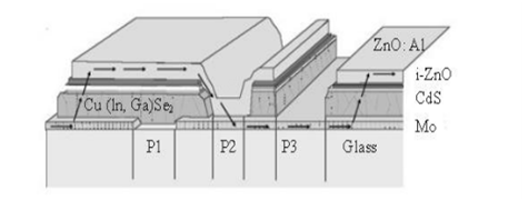 P3:制備前電極、窗口層,并對該層薄膜進行劃線,要求將前電極層和吸收層全部去除,但不損壞背電極Mo和襯底,以實現(xiàn)電池的分離。