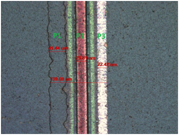 P1制程時,波長532nm,激光能量50μJ,重復(fù)頻率50kHz,振鏡掃描速度20mm/s,聚焦鏡焦距250mm;