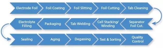 電極鍍層厚度通常為100 μm,而隔離膜為50 μm。陽(yáng)極膜是鍍石墨的銅膜,陰極膜是鍍鋰金屬氧化物的鋁膜,隔離膜則由聚丙烯和聚乙烯構(gòu)成。鋰電池生產(chǎn)過(guò)程: