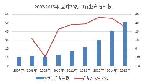 2015年,全球增材制造和3D打印市場銷售額達到51.65億美元,與2014年相比增長了10億美元出頭,增長率達到25.9%。