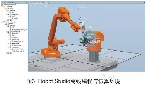 Robot Studio是ABB開發(fā)的離線編程與仿真軟件,可在電腦上完成幾乎所有的機(jī)器人編程與仿真。如圖3所示,通過Robot Studio能夠?qū)崿F(xiàn)十分逼真的模擬,并且所用的均為實(shí)際使用的機(jī)器人程序和配置文件。配合ABB Absolute Accuracy校正系統(tǒng),可以使模擬結(jié)果達(dá)到很高的精度。Robot Studio還可方便地導(dǎo)入IGES、STEP、CATIA等主流CAD格式數(shù)據(jù),然后依據(jù)這些精確的數(shù)據(jù)編制機(jī)器人程序。使用軟件中的AutoPath功能,僅在數(shù)分鐘之內(nèi)便可自動生成跟蹤加工曲線所需要的機(jī)器人位置(路徑),很好地解決了激光切割中復(fù)雜切割曲線無法通過示教產(chǎn)生的問題,大大節(jié)約了編程時(shí)間。