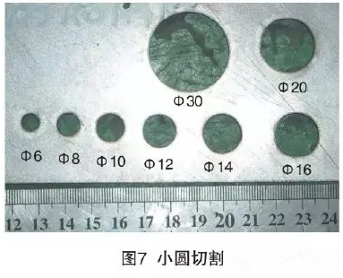 3) 高質(zhì)量的激光切割效果除了要求機(jī)器人自身應(yīng)具有很高的運(yùn)動軌跡精度外,良好的切割工藝也是必備因素。切割工藝涉及到切割速度和加速度、激光功率、焦點(diǎn)位置、吹氣量等多種因素的綜合調(diào)節(jié)。圖7為工藝調(diào)整后切割出的小圓,直徑分別為Φ6,Φ8,Φ10,Φ12,Φ14,Φ16,Φ20,Φ30,可以看出切割后的小圓熱變形很小,邊緣光潔,無明顯缺陷。經(jīng)測量,小圓的軌跡誤差約為0.1~0.25 mm,說明基于ABB機(jī)器人的激光切割系統(tǒng)具有很高的運(yùn)動精度和切割精度。