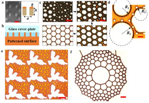 在上述研究的基礎(chǔ)上,他們發(fā)現(xiàn)這種帶有微米結(jié)構(gòu)的模板可以用于調(diào)控二維泡沫的演化。研究表明,在泡沫中的氣泡生長演變過程中,微米結(jié)構(gòu)可以對氣泡的表面曲率半徑進行調(diào)控, 進而有效地調(diào)控泡沫的演變過程。通過微結(jié)構(gòu)的調(diào)控,可以使得氣泡的曲率半徑不再隨體積的增大而增大,甚至出現(xiàn)減小的情形。對應(yīng)的演變也由原來的“弱肉強食”變?yōu)榱?ldquo;限富濟貧”的反奧斯瓦爾德熟化演變模式。通過改變微結(jié)構(gòu)的幾何排列,泡沫會演變成所設(shè)定的圖案,從而實現(xiàn)二維泡沫演化的“可編程性”。