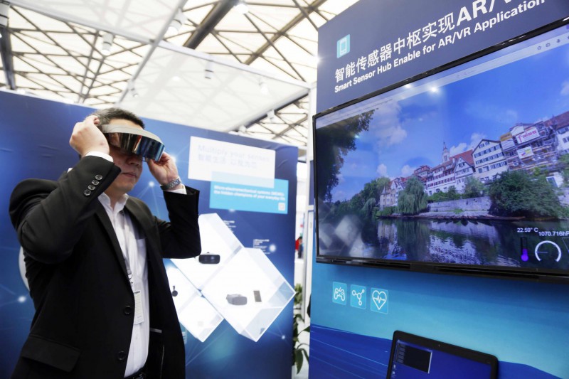 1、圖為博世集團展示的智能傳感器中樞實現(xiàn)AR(增加現(xiàn)實)、VR(虛擬現(xiàn)實)應(yīng)用,一位展商戴上眼鏡體驗。