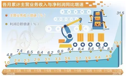 國家統(tǒng)計(jì)局?jǐn)?shù)據(jù)顯示,1~2月全國規(guī)模以上工業(yè)企業(yè)利潤同比增加31.5%,增速創(chuàng)2011年4月以來新高。31.5%的利潤增速,在很大程度上說明工業(yè)企業(yè)效益呈現(xiàn)明顯好轉(zhuǎn)態(tài)勢,無疑是實(shí)體經(jīng)濟(jì)回暖的明顯信號;更是在一定程度上說明我國目前去產(chǎn)能、去杠桿、降成本成果顯著,且改革的方向和執(zhí)行力度都保持得比較好,宏觀經(jīng)濟(jì)形勢繼續(xù)向好發(fā)展。