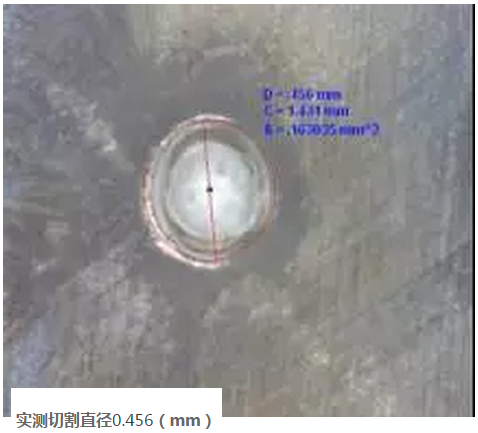切割0.5mm板材,切割出的最小圓形直徑為0.45mm左右,也即,使用特定光學(xué)配置的切割頭配合銳科RFL-C500連續(xù)光纖激光器能夠切割出的最小直徑為0.45mm圓。
